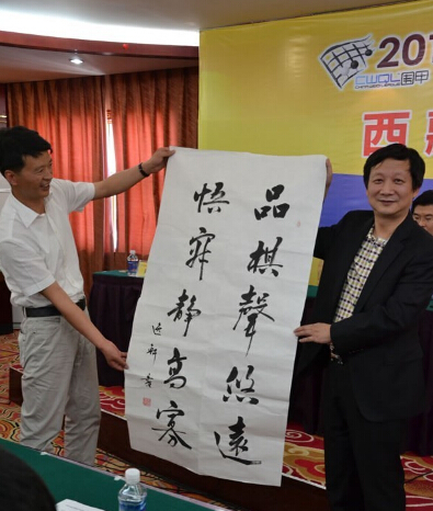 發(fā)布會最后曹大元九段代表兩隊(duì)棋手像王斌贈(zèng)送國手簽名的棋盤,王斌則用三幅字回贈(zèng)兩隊(duì)。