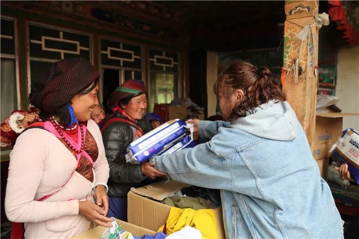 西藏阜康天使基金會(huì)副秘書長吉拉女士向村民贈(zèng)送生活用品