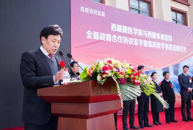 尼瑪次仁院長(zhǎng)緊接著在儀式中對(duì)西藏阜康醫(yī)院發(fā)展至今的企業(yè)規(guī)模和醫(yī)療實(shí)力表示了充分的肯定,并表示西藏藏醫(yī)學(xué)院與西藏阜康醫(yī)院全面戰(zhàn)略合作協(xié)議簽字暨臨床教學(xué)醫(yī)院掛牌儀式是一件大事,更是一件有利于雙方合作單位共同進(jìn)步、有利于廣大西藏百姓身體健康的好事,合作雙方通過醫(yī)教協(xié)同、資源共享、優(yōu)勢(shì)互補(bǔ)、共同鉆研,必將爭(zhēng)取共同攀登上一座又一座醫(yī)療領(lǐng)域的高峰,必將爭(zhēng)取在征服人類疾病的漫漫長(zhǎng)路上走得更快更遠(yuǎn)。