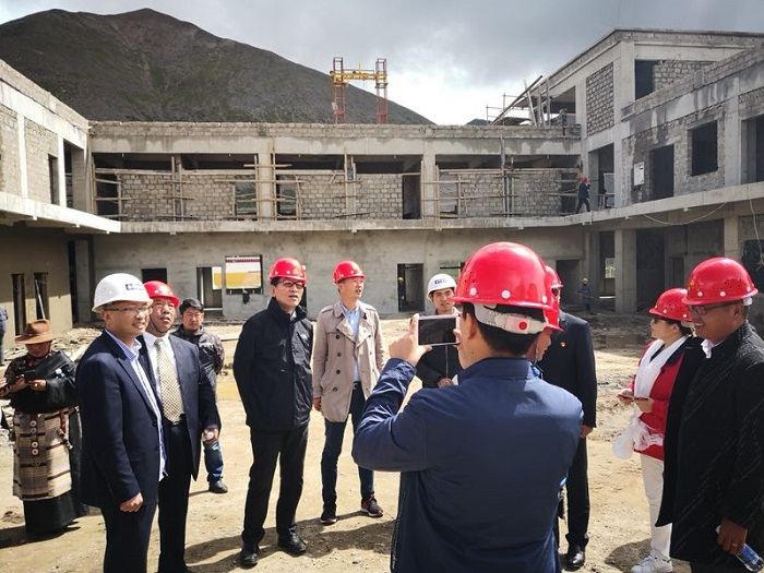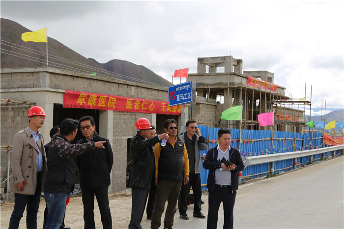 2018年了8月9日,受阜康邀請,西藏自治區(qū)政協(xié)副主席、區(qū)工商聯(lián)主席、區(qū)總商會會長阿沛·晉源,拉薩大昭寺管家洛桑,西藏自治區(qū)社會科學(xué)院原處長次旺仁青,西藏阜康醫(yī)療股份有限公司黨委書記、董事長王斌,西藏阜康醫(yī)療股份有限公司黨委副書記、副總經(jīng)理陳彬,西藏阜康醫(yī)院名譽院長嘎布,阜康生殖醫(yī)學(xué)中心實驗室主任劉鋒,阜康體檢中心主檢師瓊瑪,阿沛·晉源主席秘書旦增一行早上8點從拉薩出發(fā),一路顛簸馳騁于下午2點50分許抵達那曲地區(qū)嘉黎縣夏瑪鄉(xiāng)。聽說晉源主席要來視察衛(wèi)生院的建設(shè)工作,嘉黎縣縣長吾金不顧受傷的左腿帶領(lǐng)當(dāng)?shù)馗刹咳罕娫缭绲群蛟谙默斷l(xiāng)衛(wèi)生院建設(shè)現(xiàn)場。