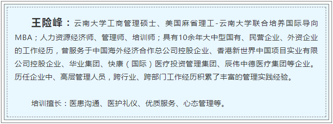 王險(xiǎn)峰以“為什么來培訓(xùn)”開題,對本次培訓(xùn)的目的與意義進(jìn)行了說明,調(diào)動(dòng)了在場員工學(xué)習(xí)積極性。接下來他對“規(guī)范醫(yī)療”、“安全醫(yī)療”、“效率醫(yī)療”、“溫度醫(yī)療”四種醫(yī)療模式進(jìn)行區(qū)別解讀,以加深員工對“優(yōu)質(zhì)醫(yī)療服務(wù)”的理解。王險(xiǎn)峰介紹,北京市朝陽區(qū)桓心腫瘤醫(yī)院院長丁劍曾說“無溫度,不醫(yī)療。溫度醫(yī)療是整個(gè)非公醫(yī)療行業(yè)的出路”,阜康作為民營醫(yī)療機(jī)構(gòu),開展“溫度醫(yī)療”,提供“優(yōu)質(zhì)服務(wù)”是發(fā)展壯大的重要途徑。接下來他就如何營造“溫度醫(yī)療”進(jìn)行展開論述,分別從“什么是服務(wù)和優(yōu)質(zhì)服務(wù)”、“職業(yè)化態(tài)度與服務(wù)能力”、“與患者家屬建立良好關(guān)系”、“語言和非語言能力及傾聽能力”、“談判技巧與化解沖突能力”、“禮儀行為規(guī)范”六個(gè)方面進(jìn)行闡釋。