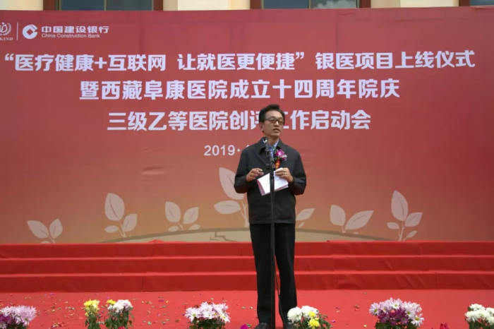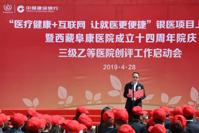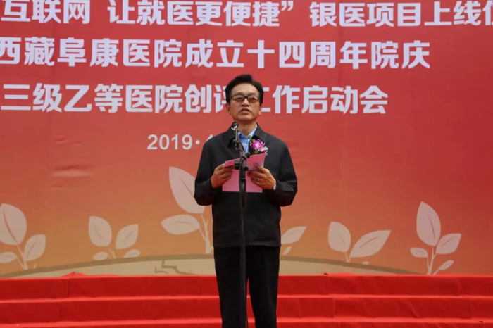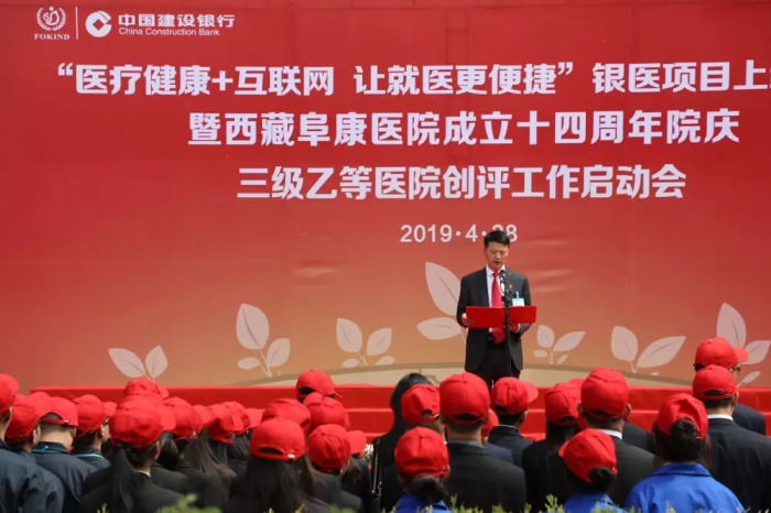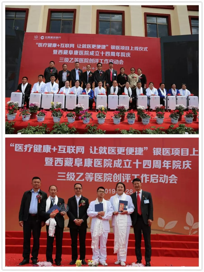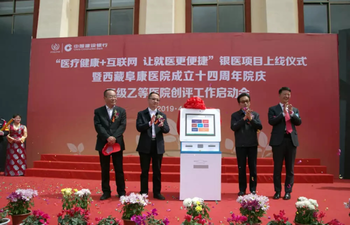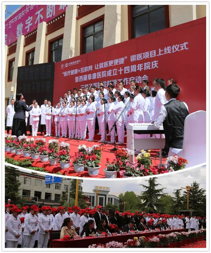 春日的圣城拉薩陽光明媚,生機(jī)盎然。2019年4月28日,注定是一個不平凡的日子!下午15時,來自自治區(qū)政府部門、各大金融機(jī)構(gòu)、科技教育單位的12位嘉賓和阜康醫(yī)院的廣大醫(yī)務(wù)人員匯聚一堂,共同見證建設(shè)銀行西藏分行、西藏阜康醫(yī)院“醫(yī)療健康+互聯(lián)網(wǎng),讓就醫(yī)更健康”銀醫(yī)項(xiàng)目上線暨阜康醫(yī)院成立十四周年院慶三級乙等醫(yī)院創(chuàng)評工作正式啟動,標(biāo)志著在雪域高原上成功走過十四年光輝歷程的阜康醫(yī)院,正在一個全新的起點(diǎn)上承載著“健康西藏”的光榮使命再次揚(yáng)帆遠(yuǎn)航、整裝出發(fā)!