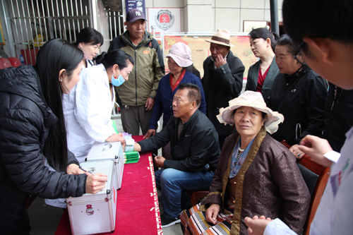 圖為自治區(qū)殘聯(lián)黨組成員、副理事長拉姆卓瑪(中)參加“殘疾預防進社區(qū)”活動