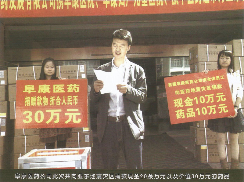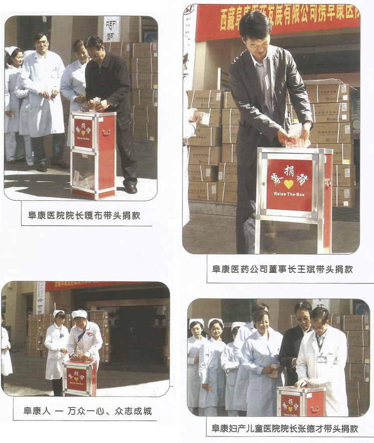 2011年9月8日,印度錫金發(fā)生了6.8級地震,地震造成了亞東縣供水、供電、交通、通信等度全部癱瘓。災(zāi)情牽動所有西藏人民的心,更牽動著阜康人的心。25日,為了支援災(zāi)區(qū),阜康醫(yī)藥發(fā)展有限公司攜阜康醫(yī)院、阜康婦產(chǎn)兒童醫(yī)院以及旗下醫(yī)藥超市舉行了為亞東地震災(zāi)區(qū)捐款儀式。在捐款現(xiàn)場,一箱箱捐助藥品整齊地堆放在起,捐歉員工排著整齊的隊伍有序的走到捐款箱邊,把自己的捐款投入到箱中。