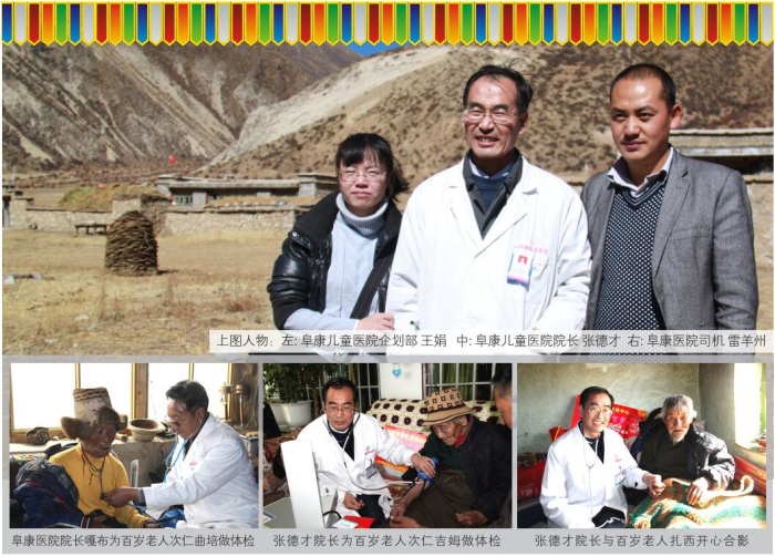 西藏高寒缺氧,自然環(huán)境惡劣。60多年前,這里的人均壽命才35.5歲。然而到了2012年,光拉薩的七縣一區(qū)就有16位百歲老人,正是這些百歲老人,見證了西藏翻天覆地的巨變,他們是全社會的寶貴財富,更是西藏從貧窮落后走向繁榮富強的親歷者、見證者。在全國人民喜迎黨的十八大勝利召開之際,西藏阜康(國際)健康體檢中心與拉薩市民政局老齡辦組織發(fā)起了“關(guān)愛百歲老人行動”。此次行動歷時16天,里程2000多公里,尋訪了拉薩七縣一區(qū)十一位百歲老人,不僅為每位老人送上了精心準(zhǔn)備的三千元現(xiàn)金、五千元健康體檢卡、一個便攜式氧氣瓶、一個便攜式血壓儀,還為他們送上了免費義診和相關(guān)藥品。王斌董事長參加了此項活動的啟動儀式,嘎布院長、張德才院長親自帶隊為每一位百歲老人做了常規(guī)的身體檢查,并送上了藥品和祝福。