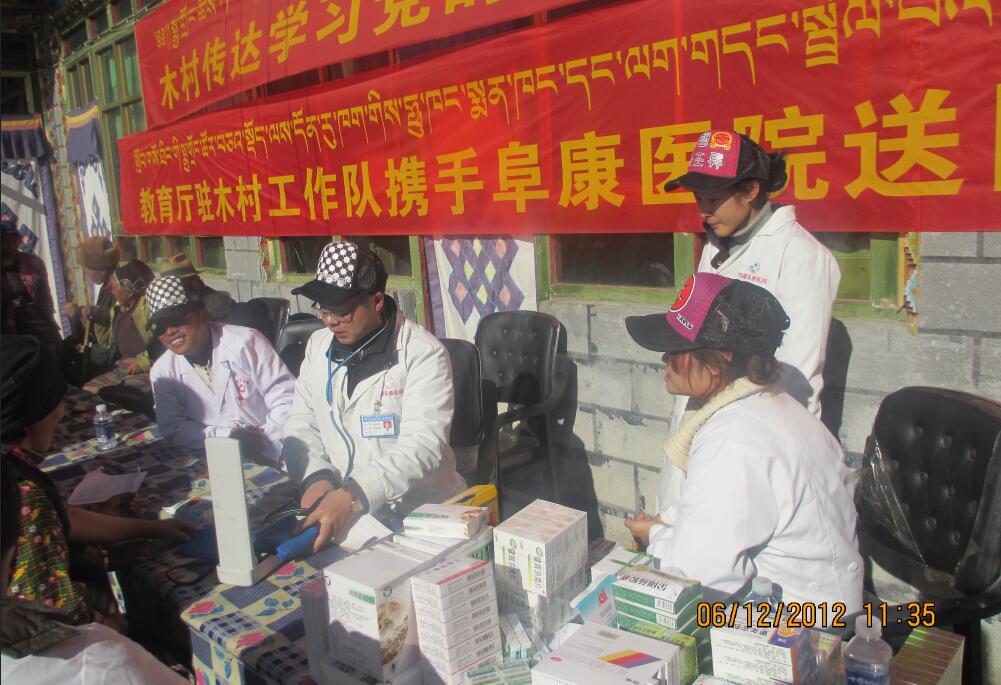 當?shù)氐鸟v村干部,生格鄉(xiāng)政府、生格鄉(xiāng)衛(wèi)生院的領(lǐng)導接待了我們,得知我們趕路沒來得及吃早餐,特意煮了粥,炒了雞蛋和僅有的幾顆青菜。在他們的組織下,木村的百姓在村委會的院子里排起了長長的候診隊伍。院子里擺好了桌子、凳子,算是簡易的診斷臺,我負責測血壓、了解病情,護士小楊負責發(fā)藥,心電圖和B超由小張負責做,當?shù)匦l(wèi)生院的吳金院長,以及醫(yī)生達次給我們當翻譯。