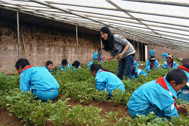 圖:白覺措帶領(lǐng)學(xué)生們在溫棚勞動