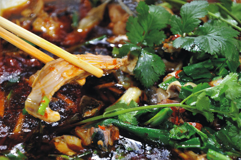 廣東人喜歡煲湯,卻把老火湯里豐富的湯料稱(chēng)為湯渣,一般只作為正菜前的消遣而已。四川人的燉菜則是絕對(duì)的主角,無(wú)論是家里的餐桌還是飯店的酒席,一般上了燉菜,也就意味著宴席進(jìn)入高潮。過(guò)去,家里最喜歡做海帶燉雞,老母雞加海帶,拍幾片生姜,扔一束香蔥,快起鍋的時(shí)候?yàn)⒁恍},湯清肉香,老遠(yuǎn)聞到就忍不住想去揭一下鍋蓋。那時(shí),我最得意的是用小碟子,只放一些干辣椒粉和鹽,舀一小勺雞湯拌勻了,做成蘸水,隨手揭一塊雞皮在蘸水里一裹,滋味純粹而濃烈,讓人每次想起,都忍不住要閉上眼睛猛吸一口氣,仿佛那味道又在舌尖上打轉(zhuǎn)。
