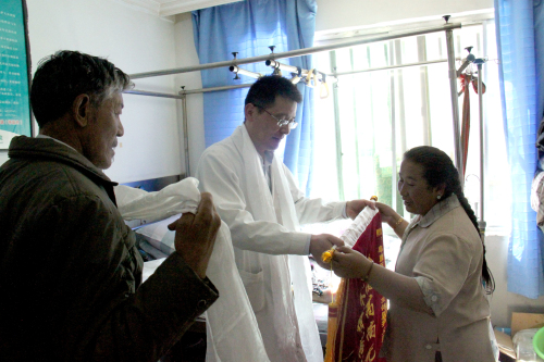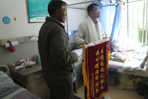 患者及家屬在出院當天,對我院的骨科醫(yī)生獻上哈達,錦旗表達了感謝之情。