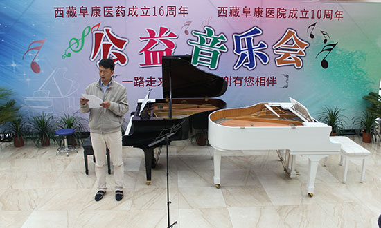 西藏阜康集團(tuán)董事長(zhǎng)王斌致詞:“阜康醫(yī)藥發(fā)展有限公司走過了十六個(gè)年頭,阜康醫(yī)院走過了十個(gè)年頭,能夠取得今天的成就,離不開各級(jí)政府部門、社會(huì)各界友好人士長(zhǎng)期以來對(duì)阜康的關(guān)心,離不開西藏百姓對(duì)阜康的信賴。今天很榮幸邀請(qǐng)到國(guó)外友人廣瀨清隆先生及邊天、董樂晨、周于蒨四位音樂家來到西藏為大家公益演出。一路走來,阜康感謝有您相伴,衷心感謝大家,希望到場(chǎng)的朋友們盡情享受這美妙的音樂之旅。”
