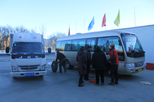 19日清晨7時,滿載物資的貨車本應(yīng)準(zhǔn)時從拉薩市出發(fā),前往日喀則目的地,但剛準(zhǔn)備出發(fā),我們的貨車卻因天氣寒冷,在香格里拉酒店的坡道上熄火。天氣太冷,發(fā)動機(jī)打不著火,這可急壞了大家伙,當(dāng)下,大家紛紛下車,一起推車。所幸,最終貨車重新啟動!可在汽車行駛至拉薩機(jī)場附近時,我們的客車又被利物刺破了前輪,并且由于天色尚早,附近的幾處修理廠皆是大門緊閉,尚未開門,好在加油站的工作人員替我們打了電話,找來了一位修車師傅!