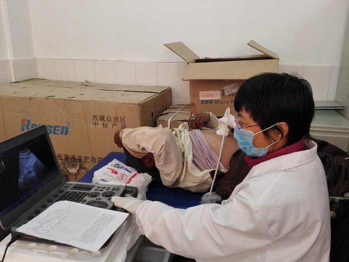 10月13日革吉縣衛(wèi)生院,鐘義華檢驗(yàn)士、劉冬梅醫(yī)師與丁雪琴醫(yī)師為周邊牧民檢查。當(dāng)忙碌的工作接近尾聲時(shí),醫(yī)療組得知還有三名行動(dòng)不便的老百姓不能前來(lái)檢查,即刻攜帶儀器,前往老百姓家里,為他們做包蟲(chóng)病篩查。當(dāng)日鐘義華組共篩查148人、1例陽(yáng)性。