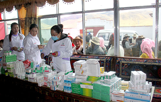 9月25日,西藏阜康醫(yī)藥公司的八名優(yōu)秀醫(yī)護(hù)人員從拉薩出發(fā),在經(jīng)歷了4個(gè)小時(shí)的路程后到達(dá)郭尼村,義診組成員忍受高寒缺氧所帶來的不適,在第一時(shí)間開始了“問診和送醫(yī)送藥活動(dòng)”,義診組根據(jù)村群眾黨員不同的看病需求,帶去了多種藥品免費(fèi)發(fā)給病情需要的牧民。在義診現(xiàn)場(chǎng),醫(yī)務(wù)人員認(rèn)真進(jìn)行檢查,耐心解答他們提出的問題,為他們提出具體的治療方案;醫(yī)護(hù)人員為當(dāng)?shù)啬撩駛儨y(cè)量血壓,并免費(fèi)發(fā)放了家庭常備藥品的各種宣傳資料。讓當(dāng)?shù)啬撩癯浞窒硎艿椒奖憧旖莸娜嬷艿降尼t(yī)療服務(wù),為牧民帶去健康的同時(shí)也帶去了關(guān)愛。