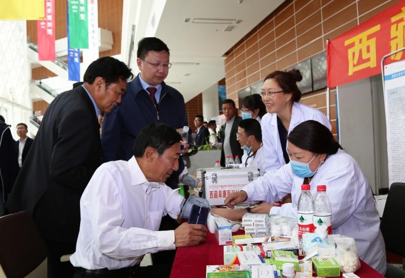 西藏自治區(qū)科技廳廳長赤列旺杰在我院展位測量血壓