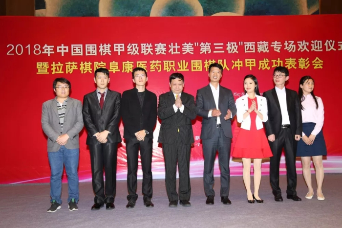 10月7日,2018年中國圍棋甲級聯(lián)賽壯美“第三極”西藏專場歡迎儀式暨拉薩棋院阜康醫(yī)藥職業(yè)圍棋隊沖甲成功表彰會在香格里拉大酒店隆重舉行。西藏自治區(qū)黨委副書記、政府主席齊扎拉,中國圍棋協(xié)會主席林建超,區(qū)政府副主席甲熱·洛桑旦增,國家體育總局棋牌運動管理中心黨委書記、主任、中國棋院院長朱國平,中國棋院圍棋部部長王誼,西藏自治區(qū)體育局黨組書記劉伯清、局長尼瑪次仁,拉薩市委常委、常務(wù)副市長占堆,自治區(qū)高級人民法院副院長佘克冰,人民日報西藏分社社長鄧建勝,山東圍棋隊主教練、拉薩棋院名譽院長、名譽總教練曹大元,世界冠軍羅洗河,山東景芝酒業(yè)隊領(lǐng)隊、齊魯晚報棋院院長劉瑋,衢州巴格斯隊領(lǐng)隊薛廣靈,新華網(wǎng)西藏分公司常務(wù)副總編輯劉子明,拉薩棋院院長、拉薩棋院阜康醫(yī)藥職業(yè)圍棋隊領(lǐng)隊王斌,中央電視臺圍棋欄目主持人、拉薩棋院常務(wù)副院長陳盈以及山東隊、衢州隊的隊員們出席了本次活動。