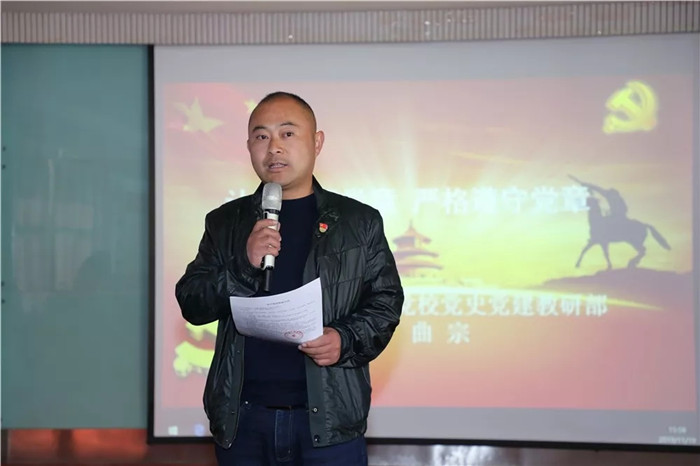 曲宗副教授首先明確了黨章 “根本大法”的地位,指出黨章是規(guī)范和指導黨的工作、黨內(nèi)活動、黨的建設(shè)的根本依據(jù)。隨后曲宗副教授介紹了黨章的歷史沿革,以及十九大修改黨章的歷史意義和重要內(nèi)容,號召每一名黨員認真學習黨章,嚴格遵守黨章,時刻與黨中央保持一致,自覺做到“兩個維護”。要求每一名黨員都把黨章作為政治思想建設(shè)方面的X光機,每年對照黨章給自己“體檢”一下,紅紅臉、出出汗,牢記入黨初心、遵守黨的紀律,維護一名黨員的思想行為純潔性。