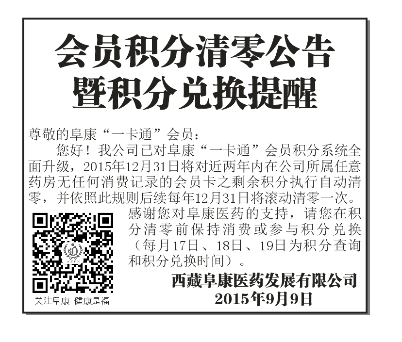 您好!我公司已對阜康“一卡通”會員積分系統(tǒng)全面升級,2015年12月31日將對近兩年內(nèi)在公司所屬任意藥房無任何消費記錄的會員卡之剩余積分執(zhí)行自動清零,并依照此規(guī)則后續(xù)每年12月31日將滾動清零一次。感謝您對阜康醫(yī)藥的支持,請您在積分清零前保持消費或參與積分兌換(每月17日、18日、19日為積分查詢和積分兌換時間)。