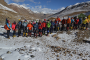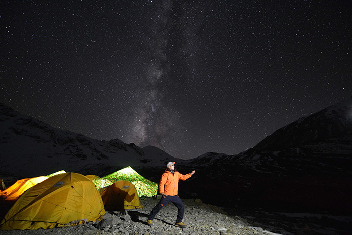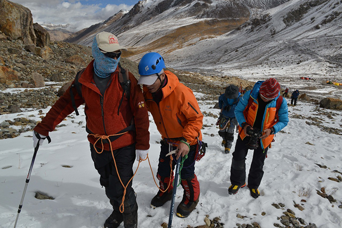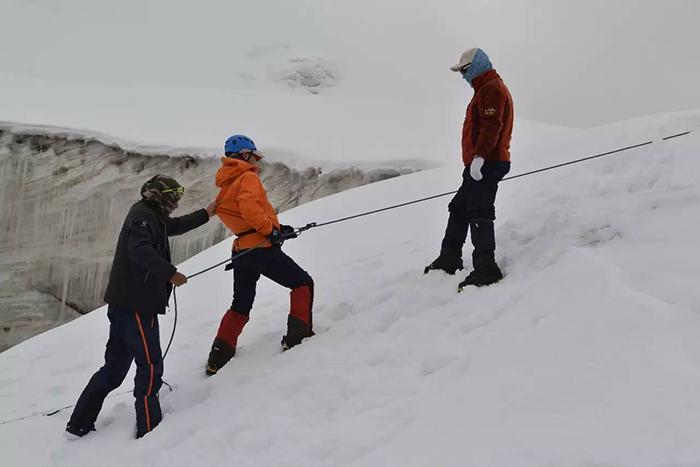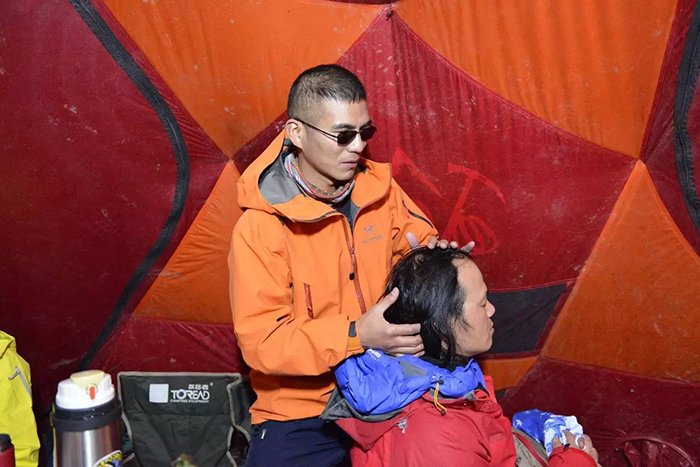 在海拔5500米處的雪線位置,教練們,選擇了一處較為平緩的雪坡,作為大本營(yíng),在這里對(duì)隊(duì)員們進(jìn)行登頂前的指導(dǎo)訓(xùn)練。指導(dǎo)隊(duì)員們使用上升器與下降器,體驗(yàn)穿著高山靴帶著冰爪走路的感覺(jué),教練們?cè)谶@里認(rèn)真介紹技術(shù)要領(lǐng),并耐心解答隊(duì)員們提出的各種問(wèn)題。休息之余大家都躲在帳篷里,有說(shuō)有笑,完全消除了屋外雪山的寒冷。有從內(nèi)地來(lái)的隊(duì)友,因高原反應(yīng),頭疼難忍,張洪就幫他們一一按摩推拿,緩解疼痛,大家就像一家人,其樂(lè)融融。