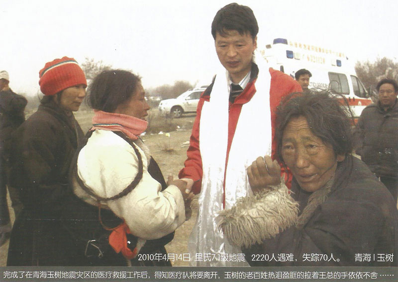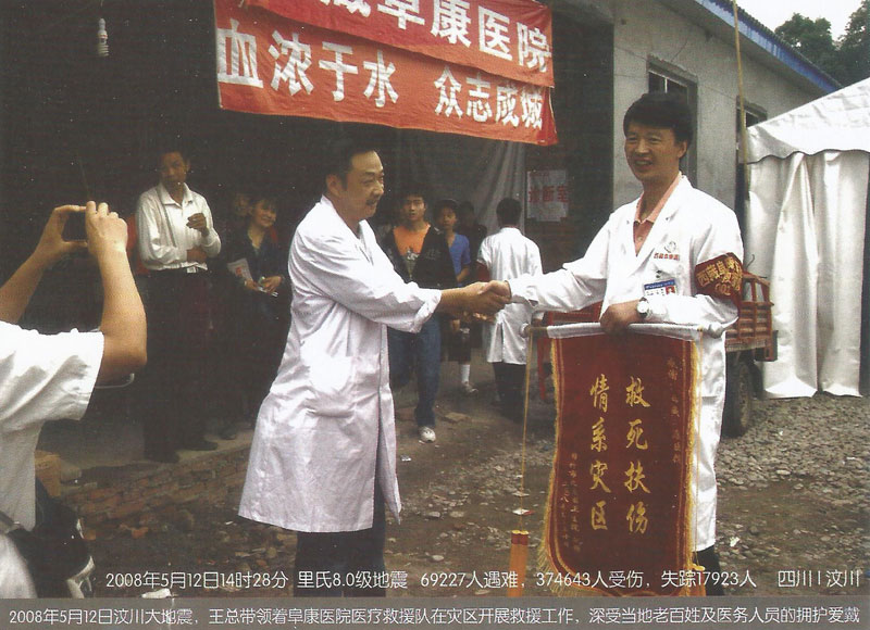 2008年5月12日14時28分,在得知發(fā)生在四川汶川8級的強烈地震后,王斌被深深的震撼了,5月13日第一時間帶頭捐款并號召全公司347名員工為災(zāi)區(qū)人民獻(xiàn)愛心,在王斌的帶領(lǐng)下短短的一上午公司即向西藏紅十字會捐款10062萬元(其中王斌個人捐款5062萬元)。13日下午,王斌隨即召開阜康醫(yī)院醫(yī)務(wù)人員趕赴災(zāi)區(qū)醫(yī)療救援動員大會,并迅速組建了一支由他本人作為領(lǐng)隊的26人醫(yī)療救援隊。同時他還帶領(lǐng)醫(yī)療隊為盡快抵達(dá)地震災(zāi)區(qū)并第一時間參與醫(yī)療救援,而且決定在成都臨時購買一輛配備完善的救護(hù)車,還包括大量藥品、生活物品、以及部分醫(yī)療設(shè)備,此次救災(zāi)共投入130余萬元。