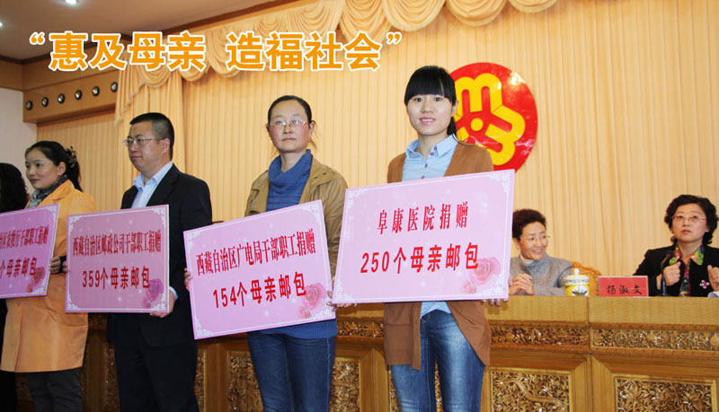 2013年5月1日上年十點(diǎn),西藏自治區(qū)“母親郵包”公益活動(dòng)暨捐贈(zèng)儀式在自治區(qū)常委會(huì)議室內(nèi)正式啟動(dòng)。西藏阜康集團(tuán)懷著高度的社會(huì)責(zé)任感心系天下母親,當(dāng)天共捐贈(zèng)總價(jià)值五萬(wàn)元的郵包250個(gè),并呼吁全體阜康人為天下母親捐贈(zèng)郵包,奉獻(xiàn)自己的愛(ài)心。