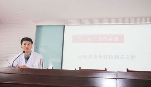 在談到員工食宿補助時,王斌董事長宣讀了相關文件,并就一些問題做出了解釋:員工的食堂補助由原來的四百元上漲到五百元;從六月份起,由三家醫(yī)院拿出部分收入補貼員工住宿,如此住宿補貼由原來的一百四十元上漲到二百四十元。以此來提高全體員工的食宿質(zhì)量,并以此來保證低收入者不為一日三餐所發(fā)愁,減輕低收入者們的生活壓力。為此,王斌董事長還要求綜合辦公室下發(fā)文件,要求食堂提高飯菜質(zhì)量,保證員工吃上品種多樣且營養(yǎng)又衛(wèi)生的飯菜。對此,張德才院長發(fā)表了自己的一些看法,也談了關于食堂的一些改革,并對王斌董事長的這項決議表示了大力支持。