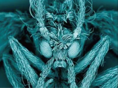 這是偽彩色處理的掃描電鏡下的毛蠓(moth fly,又稱蛾蠅)。這種蠅類的幼蟲習(xí)慣繾綣在人們家中的下水道里,時不時會從水槽里冒出來。毛蠓的軀體和翅膀上都覆被著微小的纖毛,所以看起來很像蛾子。