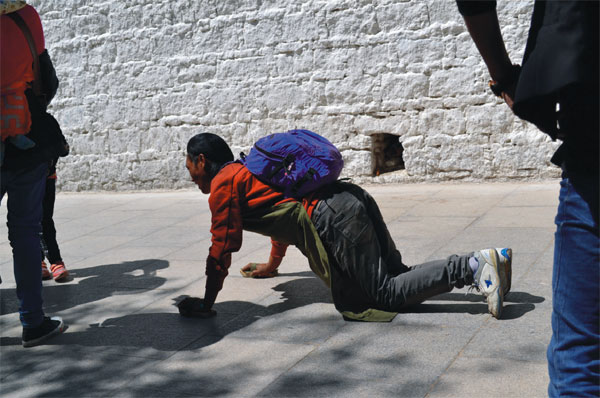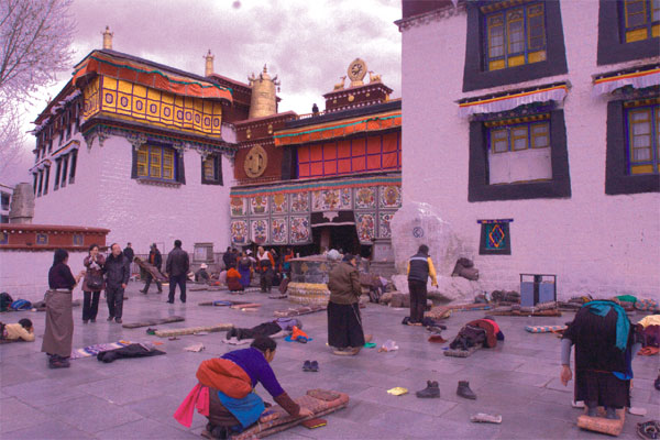 前幾天在大昭寺廣場,看人們磕長頭。人很多,其中多數(shù)應(yīng)該是牧區(qū)上來的,臟亂的衣服,掩不住滿眼的虔誠。有的人累了,便坐在那里和身邊的一或兩人輕聲地說話,大多數(shù)人,則是重復(fù)著相同的動(dòng)作:面向大昭寺,不停起身,然后跪倒全身俯地……從早到晚,日復(fù)一日,簡單而長久。