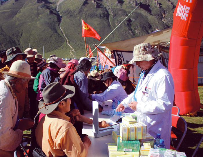 七月賽馬節(jié)期間,應(yīng)嘉黎縣縣政府及申扎縣縣委縣政府的真誠邀請。2015年7月25日,西藏阜康醫(yī)院義診隊(duì)帶著醫(yī)院的囑托、8萬元的藥品分別向嘉黎縣、申扎縣出發(fā)。7月26日,賽馬場里人頭攢動(dòng),熱鬧非凡。在西藏阜康醫(yī)院義診點(diǎn),在工作人員的維持下,大家排起了長隊(duì),自覺有序地等待著專家給他們診治。專家們?yōu)槿罕姕y量血壓、診斷病情,耐心解答他們的提問,同時(shí)就高原常見病、多發(fā)病的防治知識進(jìn)行了認(rèn)真講解,增強(qiáng)了群眾的自我保健意識。