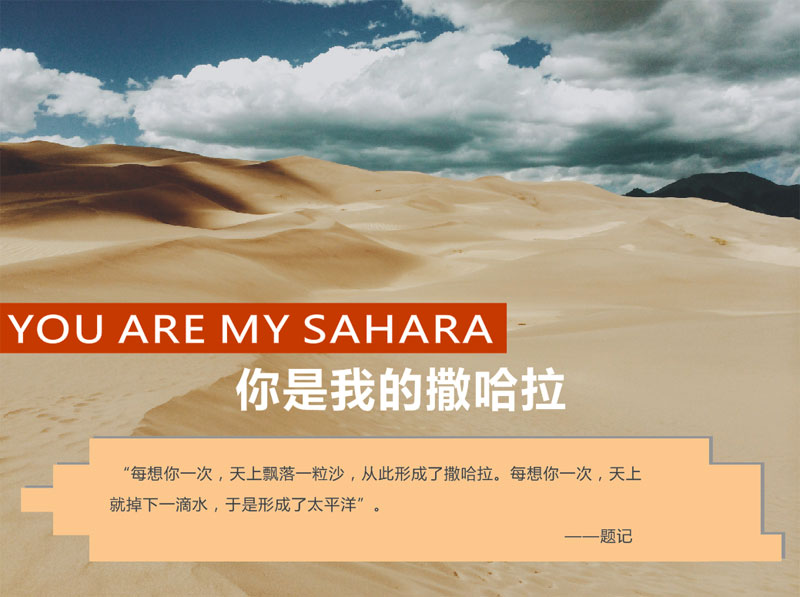 回想起第一次與你邂逅是在你《撒哈拉沙漠的故事》里,走進(jìn)你的撒哈拉,即使這里狂風(fēng)驟沙,我仍可見(jiàn)你內(nèi)心深處的安寧與幸福,你仿佛化作一只輕柔的蝶穿梭在這片風(fēng)塵里,尋覓著這里每一粒沙,每一顆石,每一縷風(fēng),洋溢著生活里的寧?kù)o與美好,只因那最愛(ài)你的蝶一直陪在你身旁,如此簡(jiǎn)單。