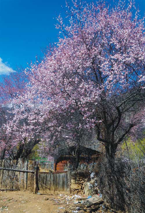 桃花溝對于外人只當(dāng)闖入了陶淵明筆下的“桃花源”,而對于波密人,這只是一個(gè)普通的村落。這些桃樹都是野生的,有的上百年,甚至上千年,一個(gè)人抱的樹是最常見的,兩三人合抱的也屢見不鮮。這些野桃樹不只是大而且多,田間、屋后、路邊、山中隨處能見到三三兩兩挺立著。最多的是在山坡上,常常是漫山遍野,呼拉拉總有成千上萬的感覺?;ㄉm柔美,卻從骨子里透出高原的雄渾和雪域驕傲的氣勢,藍(lán)天之下,碧水之畔,妖嬈多姿。每年三月中旬至四月初,漫山遍野的桃花開始鋪滿山坡,綿延至河谷。大株的桃花樹如同桃花仙子,偎依在雪山之下,與云朵相擁,形成密集的桃林。漫步其中,可見雪峰聳立,桃花怒放,清泉嬉戲,藏寨悠然,美到令人窒息。