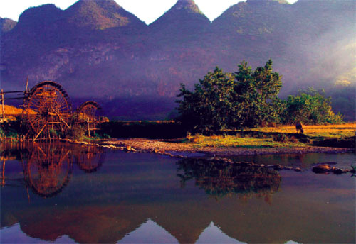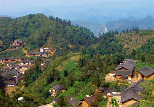 馱娘江消失在湯拿洞前,在猴爬巖洞后流經(jīng)一片崇山峻嶺環(huán)抱的平壩,又從桃源洞逝去,這個壩子就叫壩美村,一個好親熱的壯家山寨,位于云南省廣南縣八達鄉(xiāng)和阿科鄉(xiāng)之間,與廣西西林縣相鄰,一個現(xiàn)實中的世外桃源。
