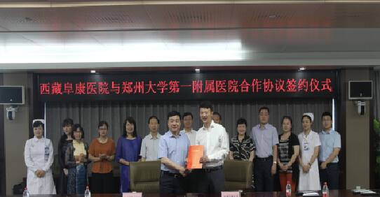 2017年6月2日上午9:00在河南鄭州大學(xué)第一附屬醫(yī)院鄭東院區(qū)8號樓會議室舉行了一場隆重的簽約儀式。西藏阜康醫(yī)院與鄭州大學(xué)第一附屬醫(yī)院在這里正式簽署了兩院合作協(xié)議。今后鄭州大學(xué)第一附屬醫(yī)院將在在遠(yuǎn)程醫(yī)療會診、??平ㄔO(shè)、人才培訓(xùn)、雙向轉(zhuǎn)診、科研合作方面,給予阜康醫(yī)院全力支持。